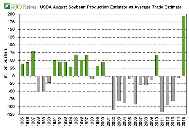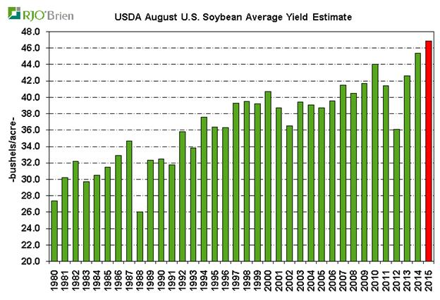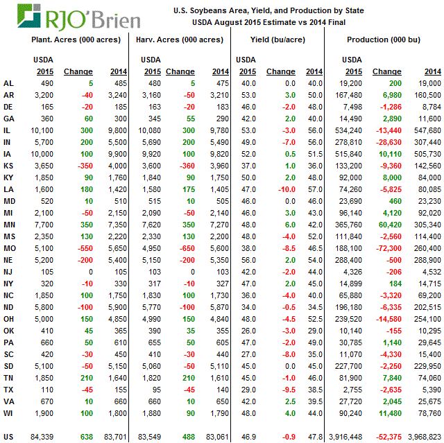 Toute l'attention était sur les révisions de la production agricole et le bilan de l’USDA. L’USDA estime la récolte 2015/16 de soja à 3,916 milliards de boisseaux avec un rendement moyen de 46,9 boisseaux / acre, ce qui reflète une projection de 192 millions de boisseaux dessus des attentes, soit une augmentation de 31 millions de boisseaux vis-à-vis le rapport de juillet, mais surtout seulement 53 millions de boisseaux de moins que le record de l'an dernier. Avant cela, la plus grande « surprise » date de 1987, lorsque la récolte a été estimé 80 millions de boisseaux dessus des attentes. Avec 192 millions de boisseaux de plus que prévu, le rapport d’aout 2015 restera gravé longtemps dans la mémoire des analystes.