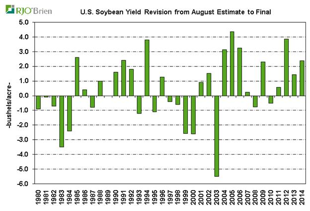 Dans l'ensemble , on doit se demander si le rendement prévu a été quelque peu influencé par le fait que l'USDA a constamment sous-estimé les rendements dans le rapport d’août au cours des dernières années . En fait, chacune des quatre dernières années et 9 des 11 dernières ont vu le rendement final de soja augmenter par rapport aux prévisions du mois d’aout, dont six de ces années avec des révisions de 2 à 4 boisseaux / acre. Les deux seules années où le rendement final était inférieur à aout étaient moins significative et tous deux de moins de 1 boisseau / acre. L’USDA a peut-être tenté d’éviter d’avoir à hausser le rendement cet automne encore, mais l'estimation de 46.9 boisseau à l’acre apparaît encore assez élevée aux yeux du marché.