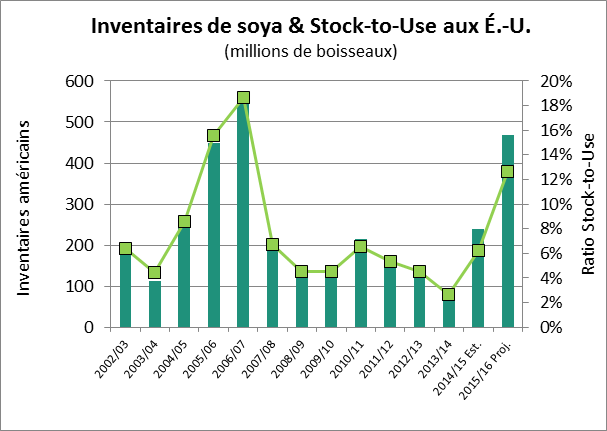 Le prix du soya ainsi que celui du tourteau se sont rapidement dégonflés depuis le rapport de l’UDSA démontrant un rendement bien au-dessus des estimés à 46.9 boisseaux/acre. Même le rapport NOPA d’hier démontrant une utilisation record de fève pour la trituration n’a pu compenser les mauvaises nouvelles, sans parler que les ventes à l’exportation sont très faibles. Notez que les exportations de fèves et de tourteau comptent pour plus de 60% de la demande totale de fève, contre seulement 10% dans le maïs, c’est donc très important. De la sorte, un mois après avoir touché son sommet à 10.50 $/boisseau, le prix s’est dégonflé pour retourner au bas du printemps dernier (graphique 1) à 9.00$/boisseau. Si on brise le support à 9.00 $/boisseau, on peut s’attendre à ce que la chute s’accélère puisque nous aurons brisé le support d’un point de vue technique. Le fondamental n’est pas très bon également : en considérant seulement une baisse de 5% des exportations (alors que nous sommes en retard de 45% sur le rythme des commandes), les inventaires de fin d’année serait le double de ceux cette année selon l’USDA (graphique 2) et les inventaires restantes à la fin 2016 pourraient combler 1.5 mois d’utilisation.