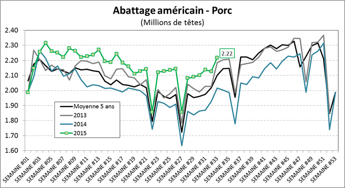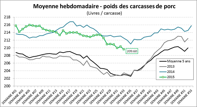 Concernant la production de viande de la semaine dernière, les abattages de porc n’étaient que 1.5% de plus qu’en 2013 et 10% de plus que l’an dernier (graphique 3). On progresse lentement vers le résultat du rapport Hogs and Pigs de juin dernier. Selon ce rapport, les abattages entre la fin août et la mi-octobre devraient être 0.6% supérieur à 2013 mais toujours 8.7% de plus que l’an dernier. De mi-octobre à la fin décembre, les abattages de porc devraient toujours rester assez près du volume de 2013 à +1.7% alors qu’on devrait abattre 6.6% de plus qu’à l’automne 2014. Donc, on peut s’attendre à ce que la production de porc diminue dans les prochaines semaines relativement aux années précédentes. Le prochain rapport Hogs and Pigs qui mettra à jour les chiffres sur le cheptel américain sera le 25 septembre. Par ailleurs, le poids des carcasses continue de diminuer, présentement à 209 lbs/carcasse (graphique 4) ce qui est 1.4% moindre que l’an dernier, c’est le plus gros écart en % depuis le début de l’année.