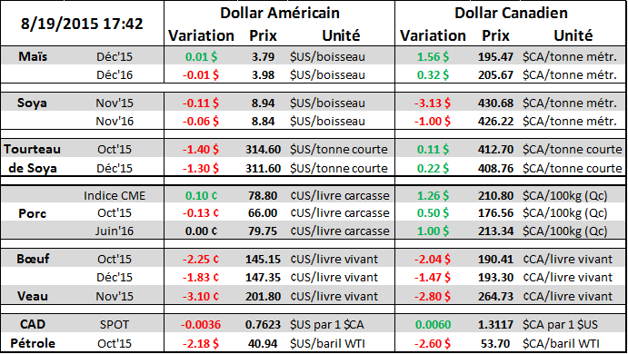 La production d’éthanol demeure stable à 965 milles baril par jour. Il reste juste deux semaines complètes pour terminer l’année de commercialisation et nous estimons donc que l’utilisation totale sera très près des dernières données de l’USDA de 5.25 milliard de boisseaux. À ce stade-ci la marge d’erreur est de plus en plus faible, +/- 25M de boisseaux tout au plus sur l’utilisation 2014/15. En fait c’est intéressant de voir comment l’USDA a dû réviser l’utilisation à chaque mois depuis la première projection l’an passé en mai 2014. Ce qui a contribué à cette hausse d’utilisation est bien évidemment la chute des prix du maïs durant l’été passé, mais aussi celles du prix du baril de pétrole qui a sur favoriser la consommation de gazoline. En fait j’irais plus loin en disant que c’est l’économie américaine dans son ensemble qui s’est améliorée depuis 12 mois ; on parle de reprise, de croissance du PIB, de création d’emploi si bien que maintenant les américains vont fort possiblement hausser les taux d’intérêt dans les prochain trimestres. On le sait, le moteur de l’économie américaine c’est les dépense de consommation alors quand les gens ont des emplois, ils ont un revenu et donc du fric à dépenser. Comme quoi avec le mandat américain sur l’utilisation du biocarburant dans une économie qui roule bien l’USDA prévoit aujourd’hui 5.25 milliard de boisseau de maïs pour l’éthanol dans la prochaine année. Ça reste des prévisions, mais on voit que c’est possible de modifier les chiffres de la demande de 200 millions de boisseaux selon les facteurs économique d’offre et demande. Jusqu’à maintenant l’USDA a déjà augmenté les prévision de 50M de boisseau pour la nouvelle récolte depuis trois mois en mai dernier. Le plus important à retenir dans cette hausse d’utilisation c’est qu’elle se fait dans un contexte où les prix n’ont pas réellement baissé! Il y a eu beaucoup de turbulence avec un spike à 4.50 $/bu en juillet mais nous sommes revenu à la case départ et l’USDA prévoit un record d’utilisation. Évidemment l’avenir le diras mais c’est un signe très positif pour la demande.