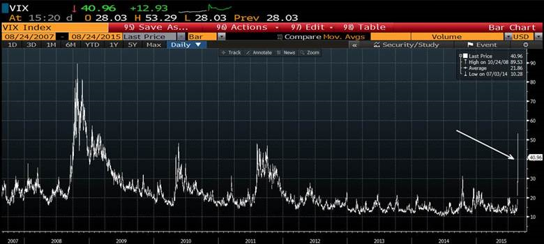 Les traders, courtiers, analystes et investisseurs qui pensaient rentrer au bureau bien tranquillement ce matin n’ont pas eu leur souhait exaucé. L’instabilité économique en provenance de la Chine (encore) inquiète de plus en plus les marchés internationaux. L’indice bousier de Shanghai a chuté de 8.49% aujourd’hui avant de se propager au marchés européens (FTSE100 à Londres à -4.67% & CAC40 à Paris -5.35%) et ensuite traverser l’océan et atteindre l’Amérique du Nord (DowJones -3.84%, S&P -4.01% et Nasdaq -3.72%). En fait c’est un réel vent de panique qui a secoué l’ouverture des parquets de New York avec une baisse de plus de 1000 points sur DowJones avant de remonter et récupérer près de la moitié de la chute. Au final c’est un climat de peur qui s’installe sur l’ensemble des marchés. On utilise le VIX comme indicateur de volatilité du marché financier américain, mais il est plus communément appelé indice de la peur. Un VIX élevé suggère une instabilité et une volatilité qui fait craindre le pire pour les investisseurs. Le « VIX » a littéralement explosé dans les derniers jours et il est en hausse de 44.88% aujourd’hui uniquement. En fait il faut retourner à 2010 et 2011 au cœur de crise de la dette dans la zone Euro pour retrouver des valeurs similaires. Pour ce qui est de l’effondrement de Lehman Brothers qui a déclenché la grande crise financières de 2008, le vix a atteint 89.53 le 24 octobre 2008.