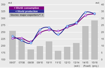 Estimation d’une production annuelle de 968Mt pour le maïs soit une année 2015/16 très légèrement supérieur à la consommation après les forts excès des deux dernières années. En comparaison l’USDA est à 985.6 Mt.