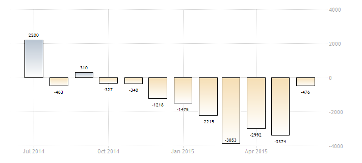 Parlant de l’avenir, il n’est pas si loin puisqu’il y a beaucoup de statistiques économiques majeures qui s’en viennent. Je vais regarder la balance commerciale canadienne jeudi matin, c’est-à-dire la différence de valeur entre les exportations et les importations, ça va nous donner plus d’information à savoir si la baisse du taux de change a pu favoriser l’export. Les États-Unis est le plus important partenaire commercial du Canada : en 2014 c’est 75% de nos exportations et 66% des importations qui se sont à travers les américains. Les économiste s’attendent à ce que la balance commerciale soit négative de 1.3 milliard de dollar. En juillet 2014, elle était positive de 2.2 milliard. Voir graph 3. Plus précisément ce sera les chiffres d’emploi au Canada et aux États-Unis ce vendredi matin qui va dominer le marché monétaire. En fait tout ça est pour tenter de voir s’il y a des signes économiques qui pourraient pousser les banques centrales à hausser/baisser le taux directeur. Au Canada il y aura une décision sur les taux le 9 septembre au retour de la fête du travail. Actuellement à 0.50% suite à une coupure de 0.25 en juillet, est-ce que la BoC peut choquer en abaissant une seconde fois les taux? Peut-être, mais pour l’instant les économistes s’attendent au statuquo.
