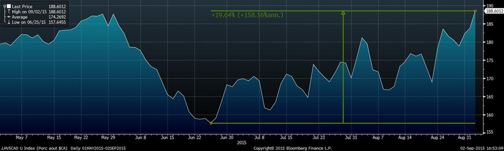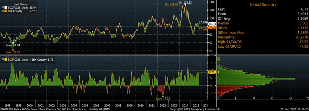 C’est une très belle journée pour les producteurs de porcs québécois! Le contrats à terme de leanhog augmente de 1.68 cents, le dollar chute pour atteindre une valeur en $CA/porc qu’on avait pas vu depuis le printemps dernier. En fait le contrat à terme sur octobre si on le remet en dollar canadien et ajuste le prix sur l’indice « Porcs Qualité Québec » on atteint une valeur de 188.60 $CA/porc, soit une hausse de 19.64% depuis le creux du mois de juin (graph 1). Dans le dernier hebdomadaire économique du CDPQ (Volume 16, numéro 21, 31 aout 2015) on pouvait voir que le revenu de vente cumulé au 100Kg était de 185.78$ tandis que le revenu stabilité ajusté de la financière agricole en date du 2 juillet 2015 était de 189.79 $/porc. L’importance de comprendre les différents mécanismes de stabilisation de prix est que si on dépasse cette valeur via les contrats en bourse, il devient intéressant d’utiliser les instruments financiers pour battre le modèle et assurer la sécurité financière de l’entreprise.