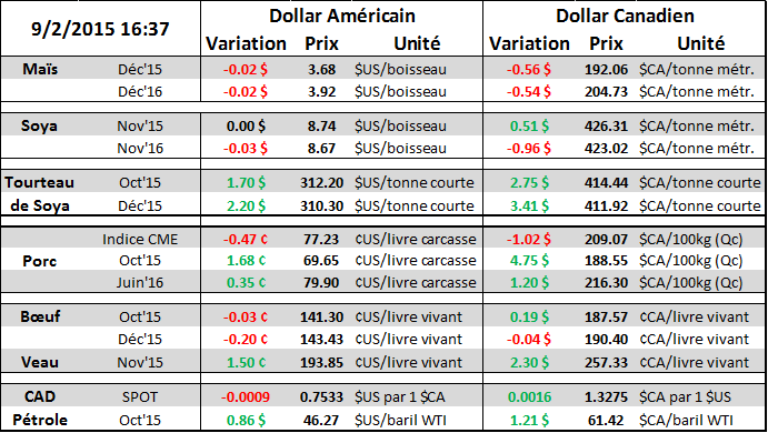 · Le prix du lean hog octobre augmente et atteint 188.53 $CA/porc sur l’indice Québec