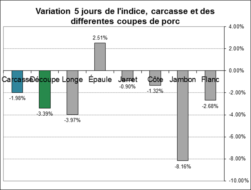Graphe 1 – Variation court terme (5 jours) de l’indice, carcasse et différentes découpes de porc. Source USDA rapport 602