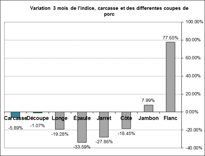 Graphe 2 – Variation moyen terme (3 mois) de l’indice, carcasse et différentes découpes de porc. Source USDA rapport 602
