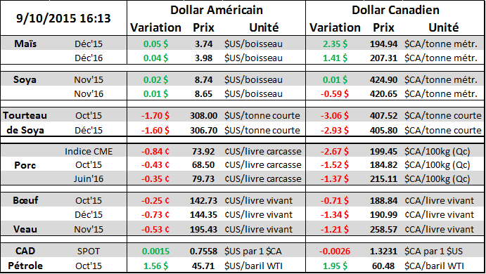 Maïs : ce qu’on regarde le plus c’est le rendement et comme prévu l’USDA a réduit sa projection pour la récolte 2015/16 à 167.50 tel qu’attendu par les analystes. La réaction du marché a été positive sans être exagérée. Au niveau de la demande rien de rocambolesque : l’utilisation sur l’ancienne récolte a été boostée par la demande domestique (+15M) et d’exportation (+25M) qui fait en sorte que 40M de boisseau ne sera pas roulé dans le stock 2015/16. C’était attendu et cela ne change pas réellement l’équilibre entre l’offre et la demande. Comme je disais d’entrée de jeu dans le corn le focus est beaucoup plus au niveau du rendement et de la taille de la récolte que n’importe quoi d’autre (pour le moment en tout cas). Pour ce qui est de la demande les modifications ont été mineures puisqu’à la fin du moins nous aurons de l’information carrément plus importante à ce sujet (Grain Stocks 30 sept). L’USDA prévoit tout de même un très forte demande de 13.755 milliard de boisseaux (graphe 1). Je regarde les stocks de grains trimestriels (Grain Stocks 30 septembre) qui donnera l’utilisation Q4 et l’utilisation 2014/15 finale, donc le stock qui sera roulé dans 2015/16. Aussi le hogs and pig à la fermeture du marché le vendredi 25 septembre. D’ici là c’est le rendement qui devrait dicter l’allure le marché. Aujourd’hui on apprend donc que le rendement est plus faible, mais faudrait tout de même pas croire que les contrats à terme vont partir en flèche demain matin. Pourquoi?