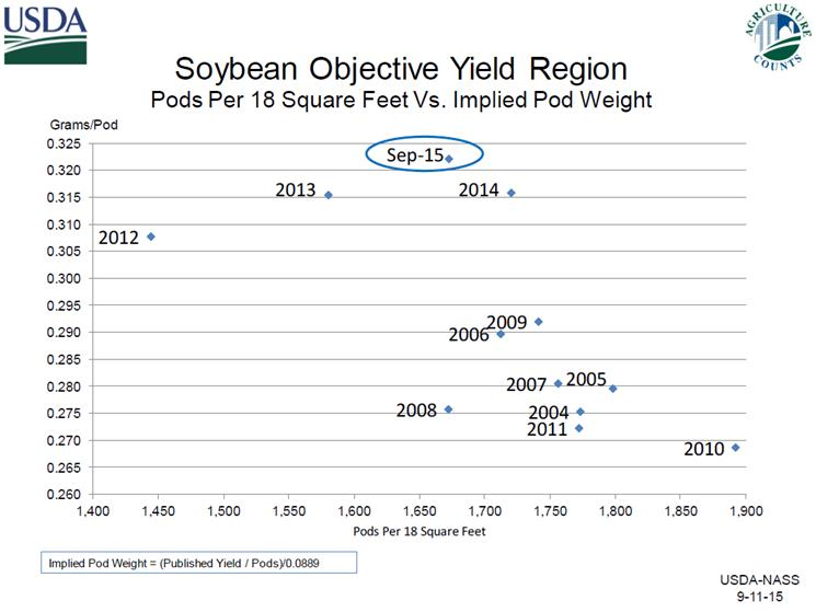 Soja : Le rendement a été revu à la hausse alors que le marché croyait à une légère baisse. Le prix a chuté rapidement mais sommes toutes a été capable de revenir en fin de séance pour clôturer quasiment inchangé à 8.75 $bu sur novembre 2015. La production s’annonce très bonne, presque comme l’an dernier avec 3.94 milliard de boisseau dans les champs (graphe 6). Les perspectives de rendement basés sur les observations dans les champs confirment que le poids de chaque gousse est très élevé (record), mais le nombre de gousses dans 18 pied carré est un peu sous les moyennes. Sommes toutes la production s’annonce très bonne contrairement aux attentes (graphe 7). Les inventaires américains sont tout simplement exorbitants ; à 450 millions de carry-out c’est plus du double de n’importe quel des stocks de fin des 8 dernières années (graphe 8). Une baisse de prix au-delà de 8$bu dans ce contexte-là ne doit pas être écartée. L’USDA n’a pas fait de modification surprenante au niveau de la demande ; sur l’ancienne récolte plus de crush et d’export comme on le prévoyait (graphe 9). Très tranquille sur la nouvelle récolte si ce n’est qu’une augmentation de 10M sur le crush. Rien de changé sur l’export 2015/16 (une chance!).