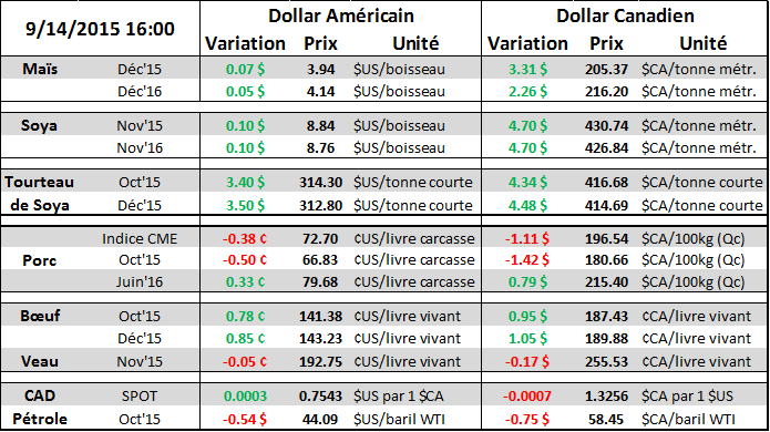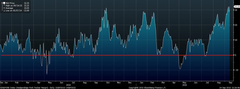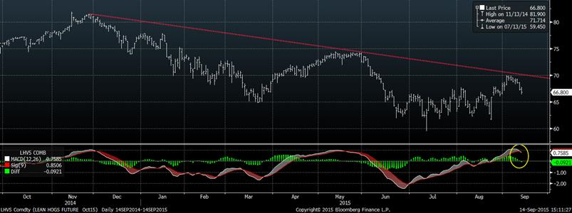 Puisque la demande semble rester forte et que la production diminue relativement aux années précédente, la valeur de la carcasse de porc découpée reste élevée à 84.80 ¢/lb aujourd’hui, soit 12¢ de plus que le prix de la carcasse non-découpée. Actuellement, ce sont les abattoirs qui profitent de la forte demande puisqu’ils encaissent plus de 32 $US/tête en découpant les carcasses, ce qui est un record depuis au moins 2 ans (graphique 3). Toutefois, le fait que les abattoirs font énormément de profit devrait les inciter à miser pour s’approvisionner le plus possible en viande ce qui est « normalement » favorable pour le prix de la carcasse. Les prix des contrats à terme ont bien performer ces 2 dernières semaines (graphique 4), mais les gains se sont vite évaporés depuis 2 jours, suivant la tendance baissière depuis 2014. Notez que le prix sur octobre semble perdre son momentum : le MACD tourne vers la baisse ce qui est normalement un signal de vendre. Cependant, les prix à la bourse de Chicago sont sous le revenu assuré par l’ASRA, n’incitant pas la prise de position sur 2015. L’emphase doit donc être mis sur 2016 pour protéger des prix.