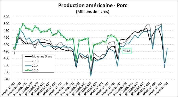 Pour une première fois cette année, le volume de porcs abattus et la production sont sous le niveau de 2013. Ces 2 dernières semaines, il s’est abattu 4.21 M de porcs ce qui est seulement 3.0% de plus qu’en 2014 et 3.2% sous la quantité de 2013 (graphique 1). Puisque la fête du travail tombait à la semaine 37 cette année contrairement aux années précédentes, on regarde la moyenne de la semaine 36 et 37 pour que la comparaison soit significative. Pour la même période, la production en livre est 1.4% de plus que 2014 et 0.9% inférieur à 2013 (graphique 2). L’offre de porc américain devient de plus en plus similaire à la normale contrairement à ce que nous avons connu depuis la début de l’année. Cela était déjà prévu par l’USDA dans son rapport Hogs & Pigs de juin, il sera très important d’analyser le rapport du 25 septembre prochain pour savoir si la production continuera à se resserrer.