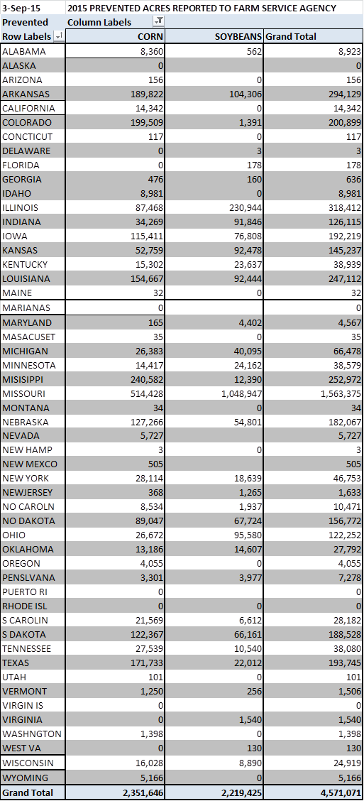 Soja : Les surfaces ensemencés sont à 80.7 millions d’acres versus USDA 84.3 c’est-à-dire 3.6 million de moins que dans le dernier rapport WASDE du 11 septembre dernier. L’argument bullish du rapport vient du fait que cette divergence de 3.6 millions est plus importante que l’an dernier alors qu’en septembre la FSA montrait -2.9 million. L’écart étant plus grand cette année certains traders tente de tirer une conclusion comme quoi l’USDA baissera les surfaces éventuellement. Plausible, faudra voir en octobre mais l’argument se tient si je me fie au Crop Progress du mois de juin alors que plusieurs million d’acres restaient à être planter. L’état le plus touché par le prevented planting (ce qui n’a pu être semé) est le Missouri. Selon FSA près de la moitié (47.26%) des surfaces non semés sur l’ensemble du territoire américain sont du Missouri avec des réclamations sur 1.04 millions d’acres.