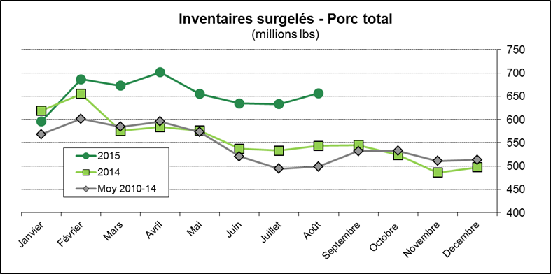 · 21% plus de porc surgelé que l’an dernier, à 656 M livres
