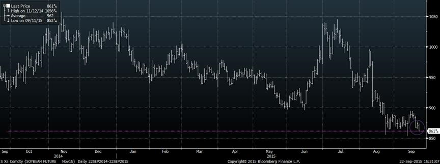 À 8.61 $US/boisseau, le prix de soya nouvelle récolte a terminé la journée à son plus faible niveau depuis le printemps 2009. Apparemment, l’arrivée du Président chinois aux États-Unis n’a pas supporté les prix, alors que plusieurs analystes prévoient des achats massives de la Chine pendant la visite du Président, de l’ordre de 3 millions tonnes. Reste à voir si des achats anormaux surviendront, ce serait l’une des seules façon de rattraper l’énorme retard dans les ventes pour 2015/16. De son côté, le tourteau de décembre a clôturé à 303 $US/tonne courte, le plus bas prix depuis 3 mois. Considérant l’abondance de fève et la marge de trituration élevée (près de 1$US/boisseau), la production de tourteau devrait continuer à osciller les records, mais qu’en est-il de la demande ? La surproduction de l’an dernier s’est bien vendue outremers, mais il se pourrait que ce surplus ne soit pas facilement vendable cette année. Plus du quart de la production de tourteau devrait être exportée, mais les ventes à l’exportation ne sont qu’à mi-chemin avec la proportion de l’an dernier… Bref tout cela pour dire que l’offre de tourteau sera élevée et que la demande extérieure pourrait s’avérer plus faible, donc négatif pour le prix sur une perspective de quelques mois.