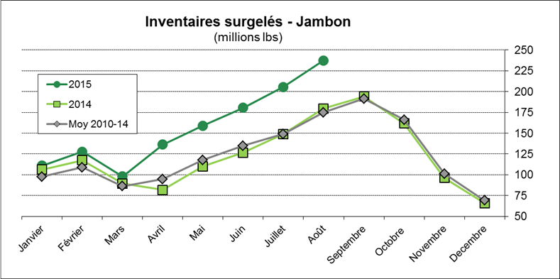 Au 31 août, la situation des inventaires surgelés de viande demeure inchangée… les congélateurs sont toujours pleins! Au total, il y avait 656 millions livres de porc ce qui est 21% plus qu’en 2014 et 32% de plus qu’en moyenne (graphique 2). Plus du tiers de ces inventaires sont du jambon, dont les stocks atteignent un record historique à 237 millions livres (graphique 3). Le prix du jambon augmente difficilement en raison de l’offre abondante, nous sommes à seulement 0.60 $US/lb ce qui est 0.24$US/lb de moins que l’ensemble de la carcasse découpée, c’est une situation extrême. L’ancien record de l’écart entre le prix de la carcasse et celui du jambon était de 0.15 $US/lb à ce temps-ci de l’année, c’est donc la principale coupe qui tire à la baisse la valeur de la carcasse. Inversement, le bacon se fait rare avec des inventaires de seulement 13.7 millions de livres, un record depuis 2010 (graphique 4). Toujours pour la période actuelle, le prix du bacon n’a jamais été aussi élevé comparativement à la valeur de la carcasse, à 1.56 $US/lb… dommage que les fesses du cochons soient plus pesantes que sa bedaine! Par ailleurs, les inventaires de jarrets, d’épaule et de retailles sont en ligne avec la moyenne quinquennale. Il y a des réserves de côtes et de longe un peu plus élevées que l’an dernier, de l’ordre de 47% et 54%, mais représentant des quantités en livres plutôt faibles.