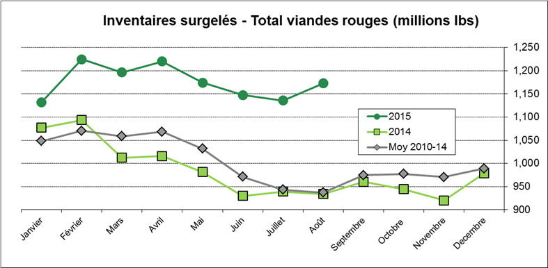 Les stocks de bœufs surgelés continuent d’être élevés, à un niveau record depuis 2007 (graphique 5) avec 470 millions de livres. Ces inventaires ont resté relativement stables tout au long de 2015 avec une moyenne de 479 M livres. Évidemment, si les inventaires surgelés de porc et de bœuf sont à des niveaux extrêmes, les inventaires de viandes rouges aussi. Avec plus de 1.17 milliard de livres, soit 25% de plus qu’en 2014 et qu’en moyenne, l’offre de viande à court terme restera confortablement abondante.