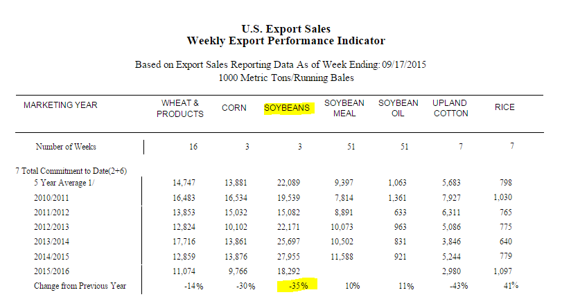 À l’heure actuelle, l’année de commercialisation vient tout juste de commencer, mais déjà les chiffres d’exportations montrent de sérieux symptômes que la demande internationale pour le soja américain n’est plus aussi forte. Les engagements actuels montre seulement 18.29 millions de tonnes, c’est 35% de moins que l’an passé!