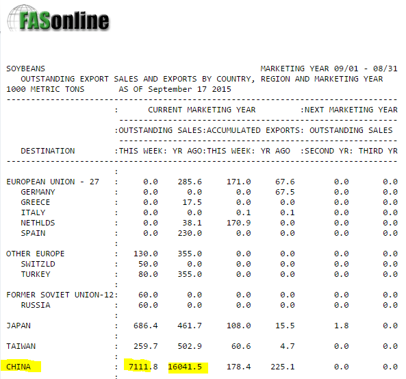 Depuis plusieurs jours on parle de la délégation chinoise aux États-Unis. On en parle parce que le marché s’attend et espère des engagements d’exportations de soja. Aujourd’hui lors d’une conférence à Des Moines en Iowa ils ont signé une entente de 13.8 millions de tonnes pour l’exportation. Le détails sur les achats n'a pas encore été publié, mais seront très probablement répartis entre les deux prochaines années de commercialisation 2015/16 et 2016/17 bien que les expéditions 2015/16 devraient être favorisée. L’entente consiste principalement en des contrats-cadres qui sont considéré plus comme des intentions d'achat que les ventes avec un prix et une date d'expédition. Il y a toujours une incertitude sur ces types de vente de la façon dont l'USDA les reflète dans les rapports officiels. L’annonce est positive, mais ces ventes sont susceptibles de simplement réduire l'écart dans les achats entre l'année dernière et cette année puisque la Chine ne dispose actuellement que de 7.1 millions de tonnes de soja américain achetés contrairement à 16.3 à même date l'an dernier.