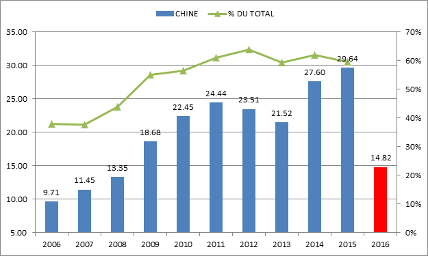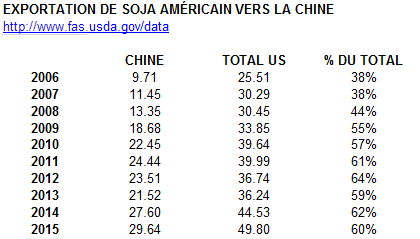 La part de la Chine dans les exportations de soja américain au niveau de la fève (j’exclu ici le tourteau/huile) est extrêmement importante. Depuis les 10 dernières années, les chinois ont augmenté leur importation de 19.93 million de tonnes pour passer de 9.71 à 29.64 en 2015. L’année dernière 60% des exportations totales américaines ont finies en Chine. On comprend bien pourquoi les analystes regardent de très près les tendances d’approvisionnement!