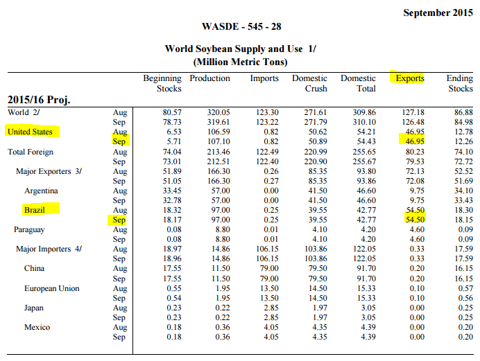 Le grand défi des américains va être la compétition du Brésil qui s’apprête à augmenter l’exportation à 54.50 millions de tonnes pour 2015/16 et surpasserons les américains de 7.55 millions de tonnes sur le marché mondial (WASDE SEPTEMBRE 2015)