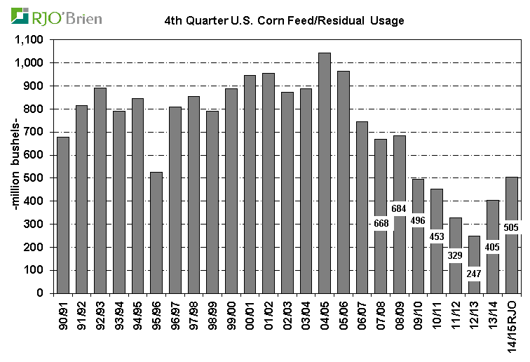 Feed : C’est là que ça se corse! Avec une solide utilisation pendant le troisième trimestre (Q3) lors du rapport d’inventaire de juin dernier, tous les yeux seront tournés vers l’utilisation pour Q4. Pour rafraichir la mémoire l’utilisation pendant Q1 et Q2 a été plus faible que prévu, on parle d’une baisse de 2-4% Year-on-Year. Par contre la demande de Q3 a été très solide avec 1.117 milliard, ce qui représente une hausse implicite de 29% par rapport à Q3 2014. Le prix du grain relativement faible et l’expansion du cheptel animal supportent la hausse de la demande sur Q3. La question à l’aube du rapport de demain c’est est-ce que la hausse des prix en juillet a été suffisante pour réduire la croissance de l’utilisation de blé d’inde du trimestre précédent. Habituellement l’utilisation durant le 4e et dernier trimestre de l’année est beaucoup plus faible. Depuis quatre ans, l’utilisation pour le feed pendant Q4 a varié entre 247 et 453 million de boisseaux (l’an passé à 405 million) mais avant 2008-2009 il était normal de voir 600-800 millions à chaque année (voir graphe 1). La taille des cheptels a considérablement réduit depuis quelques années mais est en bonne voie de reprise. Le nombre de porc est à un sommet de 7 ans tout comme le poulet et le bœuf en parc d’engraissement à son plus haut niveau en 3 ans. Bref, cela justifie les attentes pour voir une progression dans l’utilisation du feed par rapport aux années précédentes. Sommes toutes on s’attend à 505 millions d’utilisation pour Q4 qui donnerait un total de 5.290 milliard sur l’année de commercialisation 2014/15. L’USDA prévoit actuellement une demande pour le feed à 5.300 milliard, d’où les attente des analystes très proche de la cible actuelle.