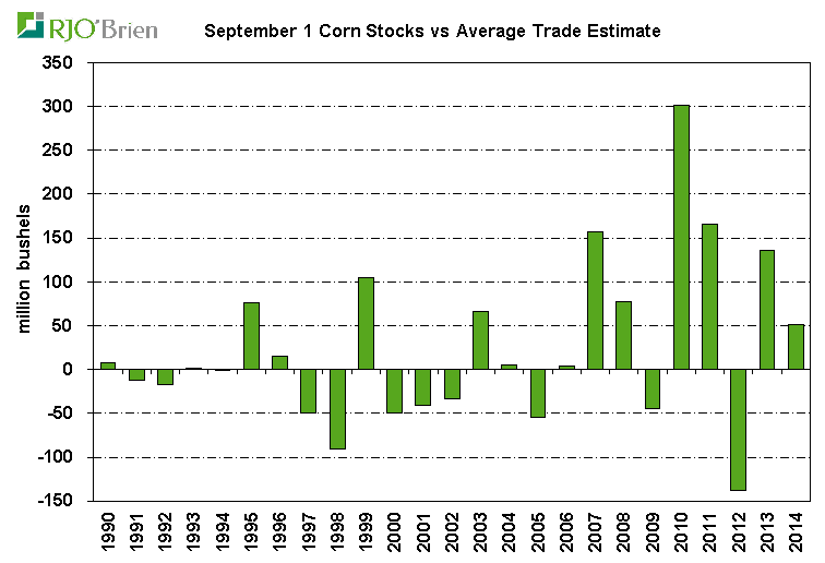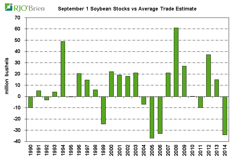 Graphe 1 – Divergence entre les attentes des analystes et les stocks de grain de septembre (source USDA et Bloomberg via RJO’Brien)