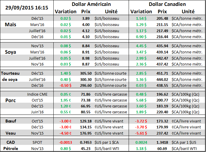 Éthanol : anciennement j’allais sur le site de l’EIA pour la production d’éthanol (j’y vais encore) mais maintenant que l’USDA publie le Grain Crush l’information est plus précise. Bingo. Je fais comme pour l’export je sors ma calculatrice, un peu de cocologie et j’arrive à 1.339 milliard de boisseaux. Il y a plus de production d’éthanol cette année versus l’an passé mais le rendement est meilleur en 2015, i.e. il y a plus d’éthanol pour le même boisseau de blé d’inde (ou plutôt moins de maïs pour le même volume d’éthanol!)