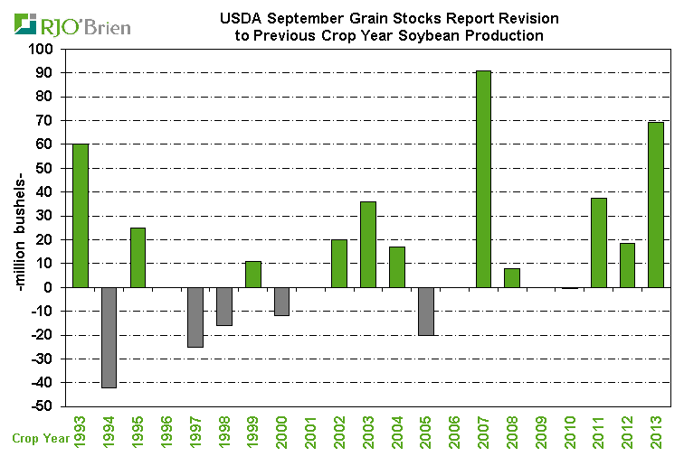 Et maintenant le joker dans le jeu de carte : l’USDA dans son rapport de juillet a haussé le résiduel à 82 millions de boisseaux en juillet passé suite au rapport d’inventaire de juin. En fait, on croit que l’USDA a augmenté son résiduel parce que la récolte de l’an passé serait surévaluée. C’est assez rare que l’USDA ajuste à la baisse la récolte antérieure (1 fois en 13 ans, voir graphe 3) mais cette année c’est peut-être le cas. Hausse le résiduel veut dire qu’il y a moins de stock que prévu qui n’est pas expliqué par l’exportation ni la trituration… bref, la récolte passée n’est peut-être pas aussi grosse que prévue. C’est l’hypothèse. Le rendement de 47.8 pourrait bien être 47.2, par exemple.