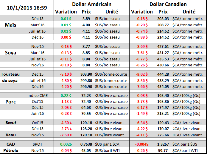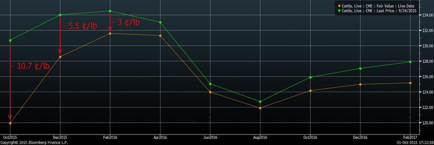 Le prix du bœuf et du porc ont connu une journée négative en baisse de 1 à 3%. Dans le cas du bœuf, les carcasses plus lourdes et un retour au niveau d’abattage de 2014 écrasent le prix court terme. Les contrats d’octobre sont en baisse de 13 ¢/lb depuis le début de la semaine et chute bien plus rapidement que les contrats sur 2016. Le marché devient en sévère « contango » ce qui signifie qu’une surabondance déséquilibre le marché et cause une chute des prix plus prononcée sur les échéances rapprochés (graphique 3). Cela n’est historiquement pas très bon pour les prix à court terme. L’écart entre le contrat d’octobre et décembre dans le bœuf était en moyenne de 2 ¢/lb durant tout l’été, alors qu’il est présentement à plus de 8 ¢/lb, démontrant la faiblesse à court terme du prix.