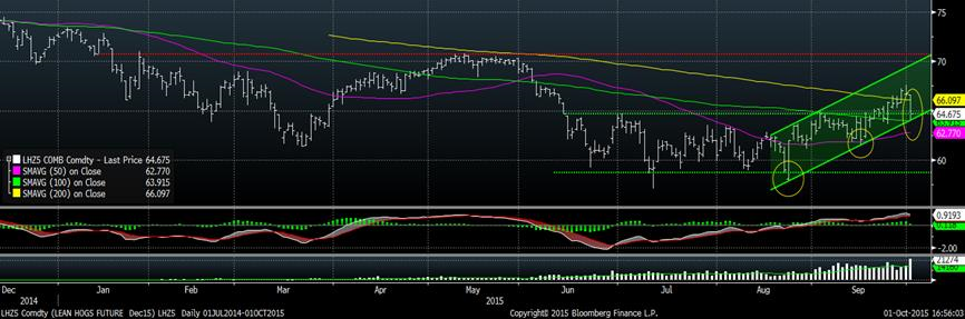 Dans le porc, les contrats ont chuté malgré une bonne performance du marché cash, en hausse d’une demie cent hier à 72.92 (indice à 72.65) en plus que le prix de la découpé était en hausse de 1.5 ¢/lb aujourd’hui, à 86.41 ¢/lb. La mauvaise nouvelle est que la chute sur décembre, sous 65.00 ¢/lb, est survenue avec beaucoup de volume, soit plus de 21,000 contrats, un record pour le contrat de décembre 2015. La « bonne » nouvelle, c’est que nous sommes exactement sur le support horizontal du prix ainsi que celle de la tendance haussière et de la moyenne mobile 100 jours (graphique 4). La tendance reste donc positive, mais la journée de demain sera déterminante pour s’assurer que la tendance se poursuivra.