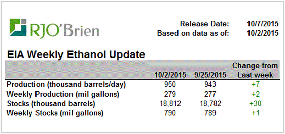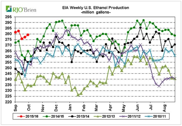 · Contrairement à la saisonnalité, la production d’éthanol ne diminue pas en ce mois d’octobre.