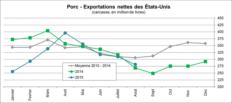 · En août, les exportations nettes de porc baissent à 282 millions livres, soient 5% de plus qu’août 2014