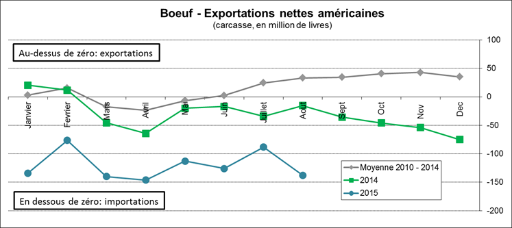 Dans le bœuf, il y a toujours plus de 100 millions de livres qui rentrent en sol américain à tous les mois. En août, c’était 138M livres (graphique 4), principalement en provenance de l’Australie. Les importations nettes sont près du niveau d’avril dernier à 146M, ce qui était un record depuis 2007. Cela s’ajoute à la production américaine, ce qui met de la pression sur les prix.