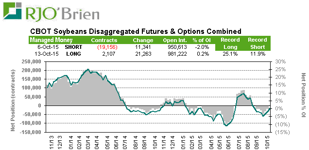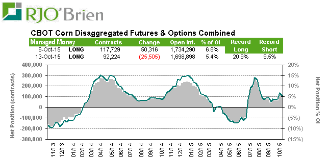 Maïs : Durement éprouvé durant l’été avec la grande variation de prix connue en juillet, les spéculateurs maintiennent le cap sur leur pari que les prix vont monter. Suite au rapport USDA d’octobre, ils ont réduit leur exposition de 25,505 contrats mais demeure néanmoins acheteur de près de 100,000 contrat et options combinés. Leur exposition correspond à 5.4% de l’open interest et ce n’est pas considéré comme anormalement élevé, réduisant ainsi la possibilité d’une large variation de prix qui leur serait attribuable. On le sait, quand il sont très acheteur ou très vendeur les fonds ont tendance à réagir rapidement et exagérer un mouvement de prix jusqu’à temps que les principes d’offre et de demande reviennent dominer le marché.