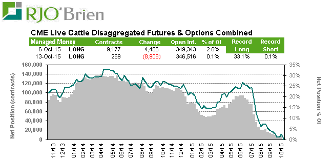 Live Cattle : C’est l’effondrement de l’exposition longue des spéculateurs qui se poursuit. Habituellement jamais short, ils sont tout près de l’être. L’open interest pourtant presque la même qu’en juin, les spéculateurs tant qu’à eux ont vendu près de 100,000 contrats et option. C’est une situation presque jamais vue. L’important rebond des prix de quasiment 20 cents la livre sur le CME n’est donc très peu ou pas attribuable au hedge funds! En fait, les fonds n’ont aucunement participé au rallye des deux dernières semaines. Avec la tendance baissière clairement renversée, est-ce que nous allons assister à un retour des investisseurs dans le bœuf? Si c’est le cas il faudrait s’attendre de les voir revenir à 10% de l’open interest, c’est quand même des achats de 35,000 contrats et options. Définitivement il pourrait y avoir de la volatilité dans ce marché dans les semaines/mois à venir.