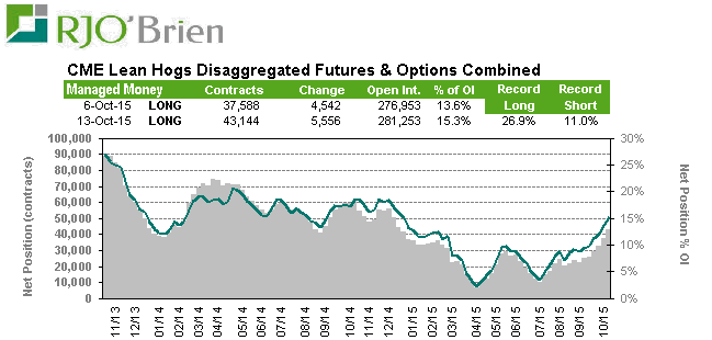 Lean Hog : Tendance clairement haussière dans l’exposition des fonds sur ce marché depuis le début de l’été. Encore loin des niveaux connus en novembre 2013 au début de la crise de la DEP (26.9%), les spéculateurs contrôlent maintenant 15.3% de l’open interest. C’est une position significative qu’il faudra regarder de près puisqu’une nouvelle négative pourrait les précipiter à sortir marché en même temps et ainsi exagérer le mouvement baissier sur le prix des contrats en bourse.