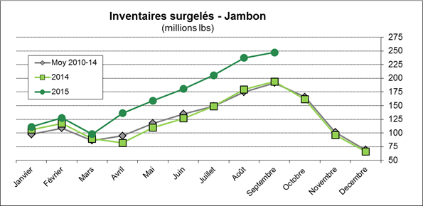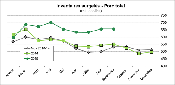 · Inventaires surgelés de porc à 656M livres, inchangés depuis août mais 19% de plus que septembre 2014