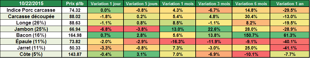 Tableau 4 - Prix et variation des coupes de porc