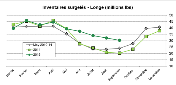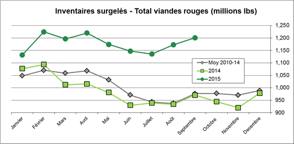 · Inventaires surgelés de viandes rouges à 1.2 milliard de livres, 24% de plus qu’en septembre 2014