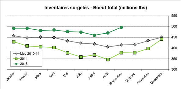 · Inventaires surgelés de bœuf à 496M livres, 5.5% de plus qu’en août et 31% de plus qu’en septembre 2014