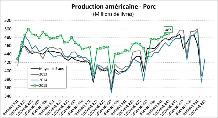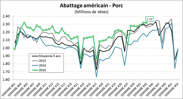 · Abattages hebdo de porc à 2.32 millions têtes, inchangés depuis la semaine dernière et 2.5% de plus que 2013