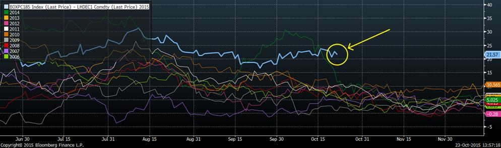 Seulement 48 heures après s’être transigé à son sommet de 4 mois 1/2 (graphique 1), le contrat à terme de porc sur décembre était en baisse de 3 ¢/lb durant l’après-midi pour finir la journée légèrement au-dessus de la limite baissière. Le mouvement a commencé avec une ouverture légèrement dans le rouge, mais une fois la tendance haussière et la moyenne mobile 200 jours brisées, les vendeurs sont venus envahir le marché. Il s’est transigé 33 600 contrats sur décembre ce qui est 50% de plus la journée précédente la plus active ce qui est normalement une confirmation du mouvement. On peut donc attribuer la majeure partie de la baisse d’aujourd’hui a des facteurs techniques ainsi qu’à la dépréciation de la devise européenne qui a perdu 3% en deux jours face au dollar américain, rendant la viande européenne moins chère aux yeux des acheteurs internationaux. Au niveau actuel, les écarts entre le prix du contrat de décembre et ceux du marché cash sont anormaux. D’une part, l’écart entre l’indice du prix cash et celui de décembre est de 10.7 ¢/lb (graphique 2) ce qui est contre la tendance saisonnière et le deuxième écart le plus élevé après 2014. D’autre part, l’écart entre la valeur de la carcasse découpée et celui du contrat de décembre est de 21.5 ¢/lb, un record surpassant même l’énorme écart de 2014 (graphique 3). En d’autres mots, le prix du contrat de décembre est maintenant très bas comparativement au marché cash, mais notez que cela n’est pas gage d’une augmentation du prix sur décembre, ça peut aussi être une contraction du marché cash qui pourrait causer un retour à la normale.