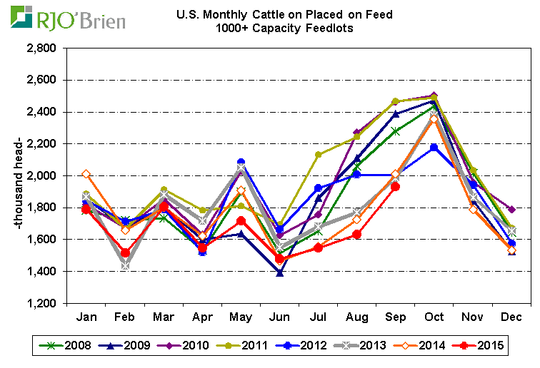 Placement : les placement du mois de septembre totalisent 1.93 million de bœuf, soit 4.1% de moins qu’en 2014. Les placements de septembre 2015 sont les plus faibles des 8 dernières années et confirme donc l’intention de rebartir le troupeau.