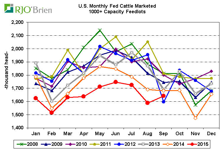 Marketing : Les ventes de bœuf gras en septembre auront été de 1.64 millions de bêtes, soit 2.4% de moins qu’en 2014. Les ventes de septembre 2015 sont les 2e plus faible depuis 8 ans.