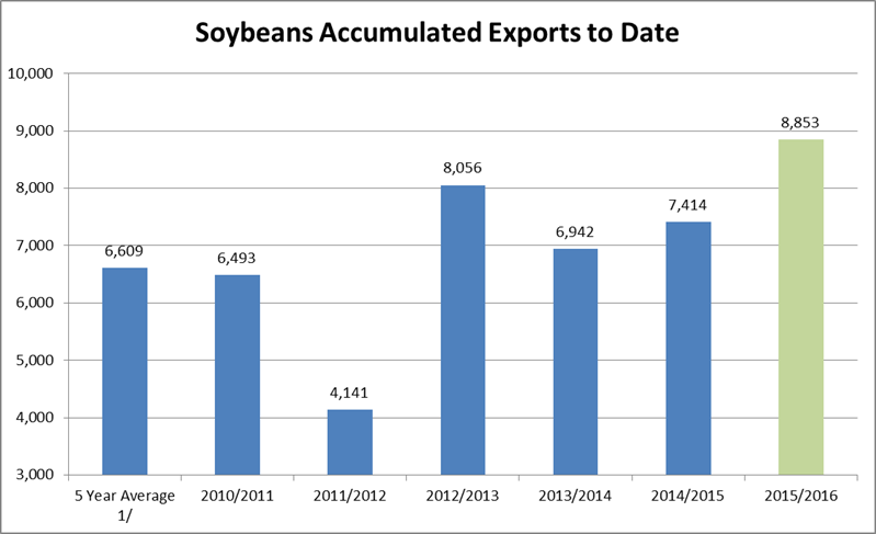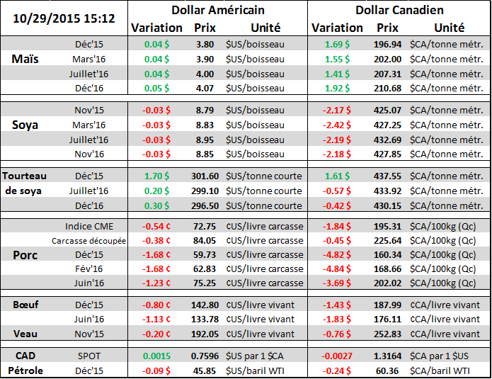 Soja : Après des semaines et des semaines d’exportations décevantes, le rythme revient en force. Les exportations de cette semaine ont atteint plus de 2 millions de tonnes métrique et c’est plus que prévu. En fait, oui et non puisque je remarque que l’USDA a revu les chiffres de la semaine dernière, ce qui gonfle artificiellement les données cette semaines. L’ajustement est mineur et il faut retenir que les exportations reprennent solidement. À date le commitment total est à 27.3 millions de tonnes, c’est 59.8% de la cible USDA pour 2015/16. Après un très lent départ comme je le disais d’entrée de jeu, l’exportation à 59% de la cible USDA se rapproche graduellement du rythme habituel qui suggère 63.5% à ce temps-ci de l’année. L’USDA prévoit que les exportations cette année seront 10% plus faibles que l’an passée avec une projection de 45.6 millions de tonnes versus 50.2. Un autre élément positif c’est que les exportations réalisées sont en avance sur les années passées. À date c’est 8.85 millions de tonnes qui sont déjà parties, comparativement à 7.45 à pareille date l’an dernier et c’est le meilleur départ depuis bien des années! . Cette donnée est positive parce que les exportations accumulées ne peuvent pas être annulées ; ça fait du sens car le bateau est déjà parti! Dans la même veine, il faut être prudent avec le « commitment total », parce qu’il peut toujours y avoir des annulation en cours de d’année. Est-ce que les Chinois achètent le soja américain comme police d’assurance au cas où il y un problème au Brésil tant sur la récolte que sur la logistique portuaire. C’est définitivement à surveiller et prendre en compte avant d’être trop optimiste. Je pense que si les exportations accumulées demeurent aussi forte dans les prochaines semaines, l’optimisme sera justifié!