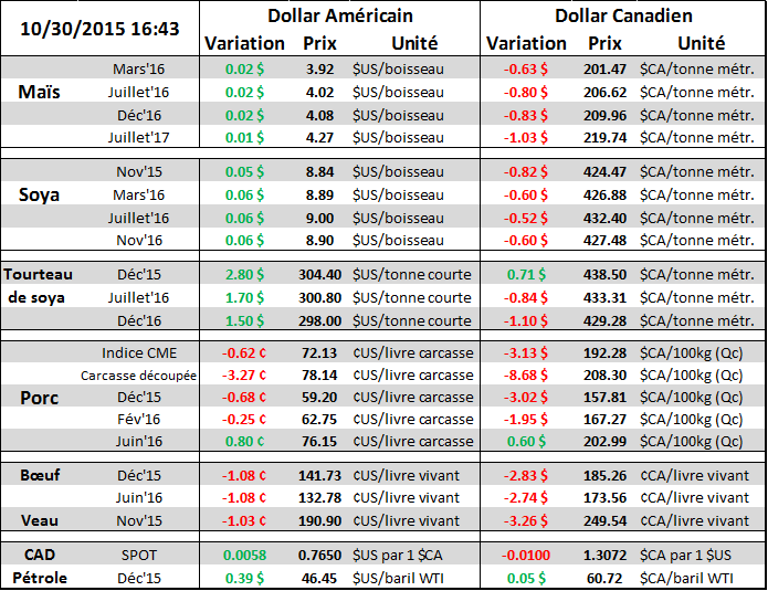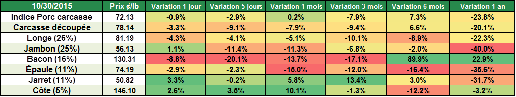 Ce fût une semaine particulièrement difficile pour le prix du porc après la publication de l’Organisation Mondiale de la Santé concernant l’impact de la consommation de charcuterie et viande rouge sur l’apparition d’un cancer. Bien que l’étude démontre qu’une consommation quotidienne supplémentaire de 50g de viande transformée augmente le risque d’avoir un cancer colorectal de seulement 7 à 8% (d’où le +18%), la nouvelle s’est rependue, voir transformée, à travers les nombreux réseaux sociaux et la demande risque de diminuer à très court terme pour les viandes rouges. Alors que l’impact sur la demande semblait faible en début de semaine, il a été très violent depuis hier sur le prix du bacon qui a passé de 1.57 $US/lb à 1.30 $US/lb en 2 jours (-17%) en plus du jambon qui a beaucoup baissé, environ -11% cette semaine (tableau 1). Même si la valeur du porc découpé avait peu baissé au début de la semaine (-1.5¢ en 3 jours), on dirait que la demande commence à tomber puisque la valeur de la carcasse découpée a baissé de 7% depuis 2 jours, passant de 84¢ à 78¢/lb.