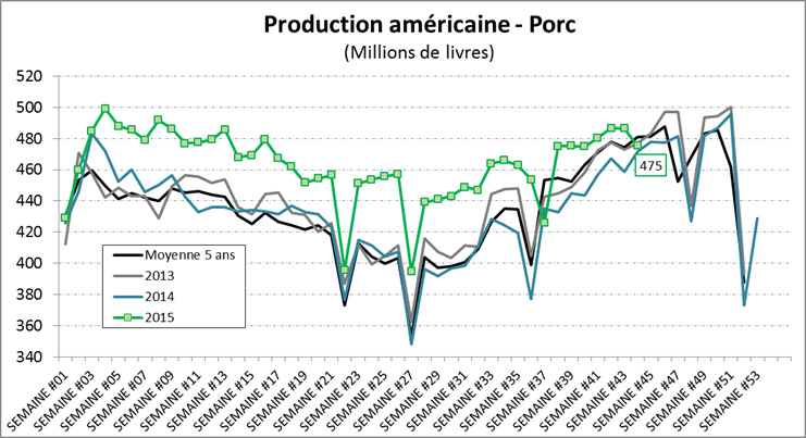 · Pour la 1ère fois en 2015, la production de porc est plus faible que 2013 et la moyenne 5ans