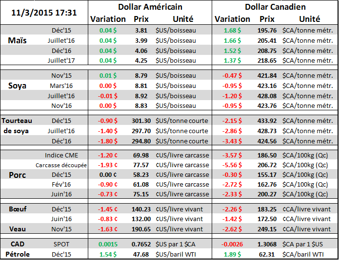 Journée relativement stable sur les marchés à terme de céréales. Je surveillais Informa Economics qui mettait à jour ses prédictions de rendement dans le maïs et le soja. Pour les deux types de grain la firme privée a rehaussé ses prévisions de rendement à 170.1 pour le maïs, c’est un bon de 1.7 boisseau à l’acre par rapport à son dernier rapport et c’est aussi plus que l’USDA présentement à 168. Dans le soja aussi Informa prévoit un meilleur rendement que dans sa dernière projection du 2 octobre dernier. Ils prévoient un rendement de 47.9 boisseau à l’acre et le ministère de l’agriculture est à 47.2.