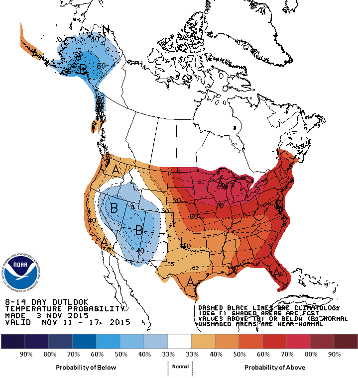 Coté météo les forecast sont favorables pour finir la récolte de maïs et de soja, mais aussi pour redresser les cultures de blé d’hiver avant de tomber en dormance. Les températures seront au-dessus des normales saisonnières ce qui permettra au blé d’hiver d’absorber l’eau reçu avant que l’hiver s’installe. Attendez-vous à ce qu’il y a des bonne chance de voir les conditions du blé se redresser dans le Crop Progress de lundi prochain. Pour l’instant l’USDA qualifie le blé de 49% good/excellent en hausse de 2% mais sous les 59% à pareille date l’an passé.